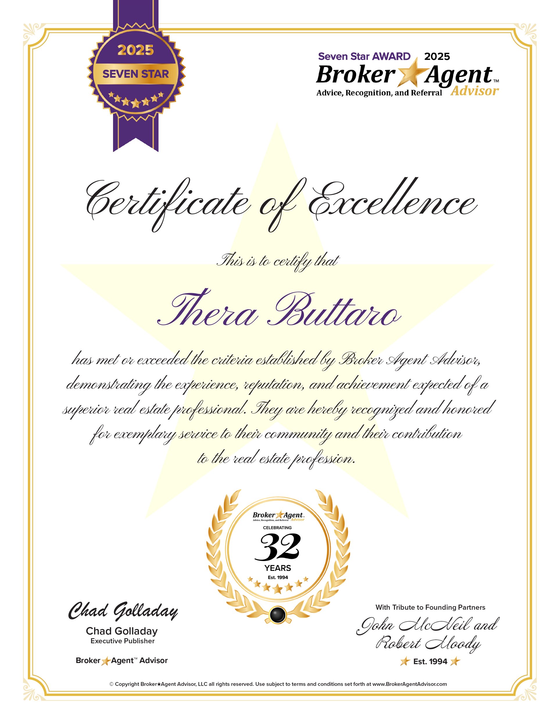 Through proprietary criteria, formulas, and other valuable considerations, Thera Buttaro has been certified by Broker★Agent Advisor in the Seven Star category as one of the best in real estate based on achievement, potential, leadership, ethics, community value, experience, capability, and trust.